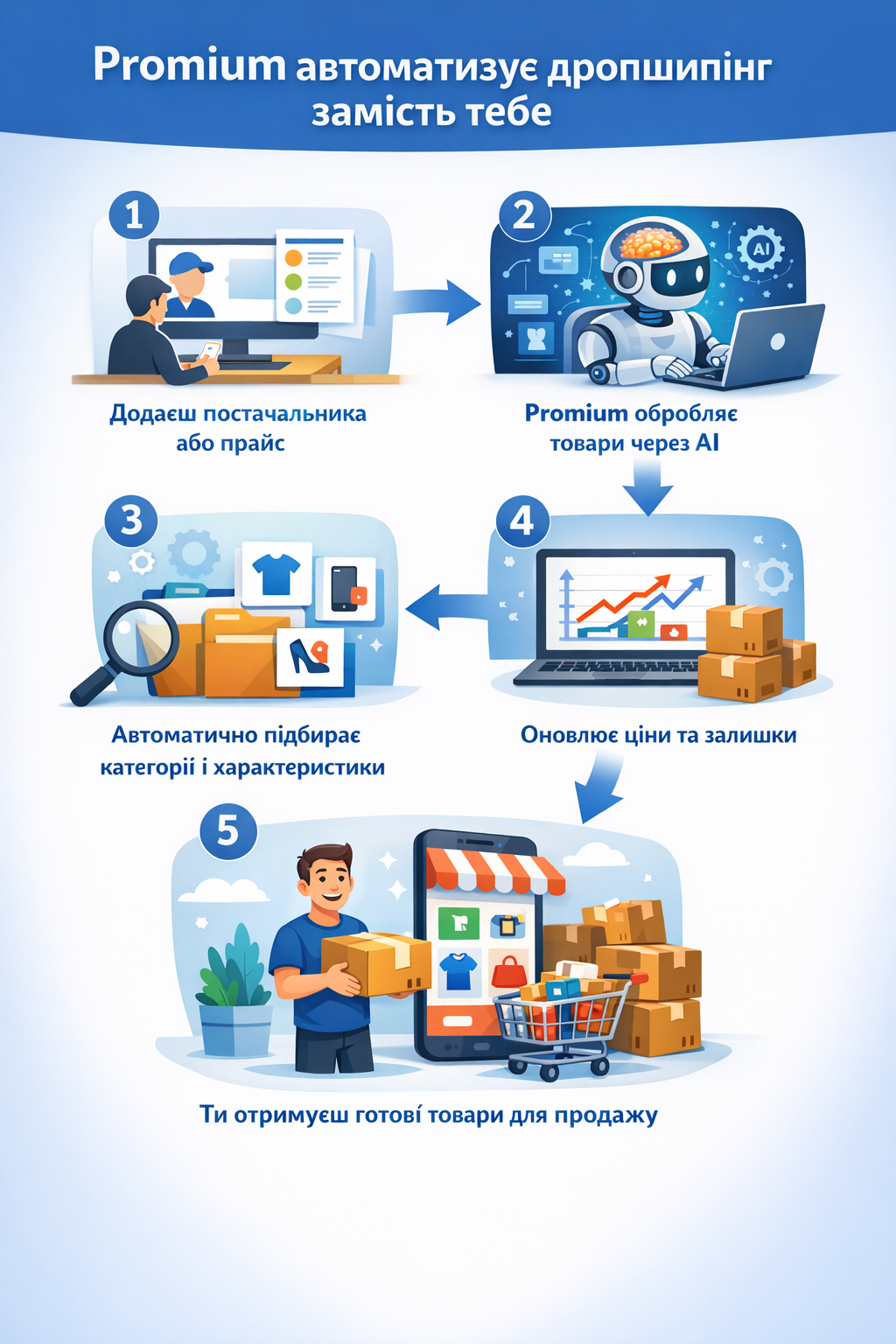 Підключай постачальників, завантажуй тисячі товарів, синхронізуй ціни та залишки, автоматично заповнюй характеристики та описи за допомогою AI